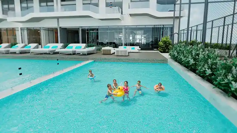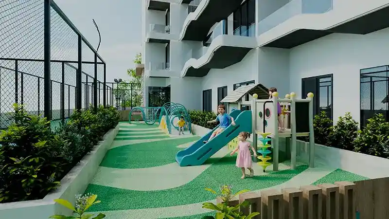 Recognised by the signature and unique facade style of Reef, this tower configures a basement, a ground, 3 podiums, and 20 levels. The exterior captures a sea-wave-like infrastructure with huge glass windows. Every home is elevated with the provision of Reef’s exclusively globally patented outdoor-cooled sunken balcony so that all residents can have panoramic views of the landscapes and outdoor moments in Dubai’s intense summer. The world’s first Outdoor Cooled Garden Lounges are the shared spaces for natives to access comfort and meaningful moments in the blooming nature.