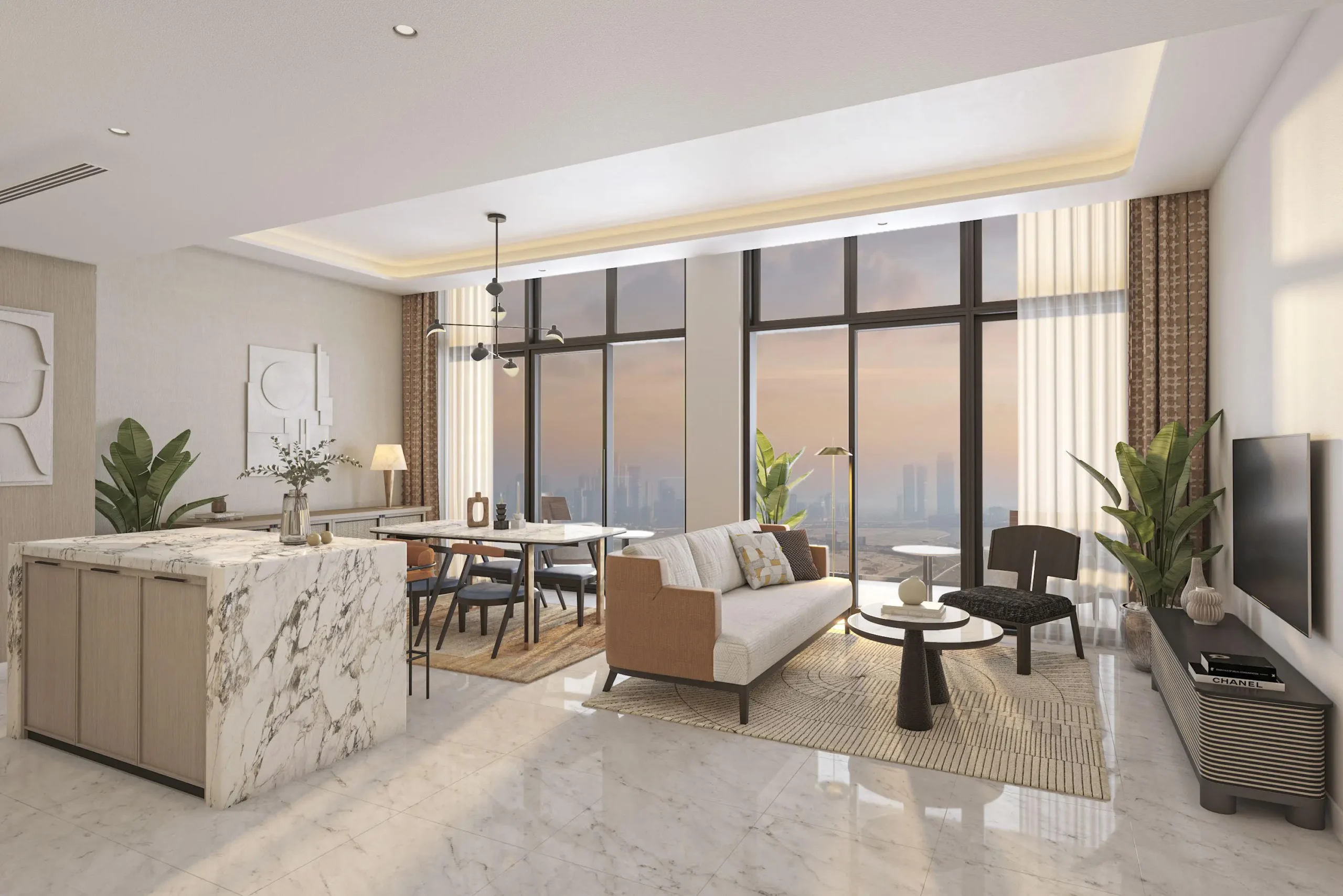 Interiors are finished with high-quality materials in soft, neutral tones, complemented by expansive floor-to-ceiling windows that enhance natural light and create bright, spacious living environments.