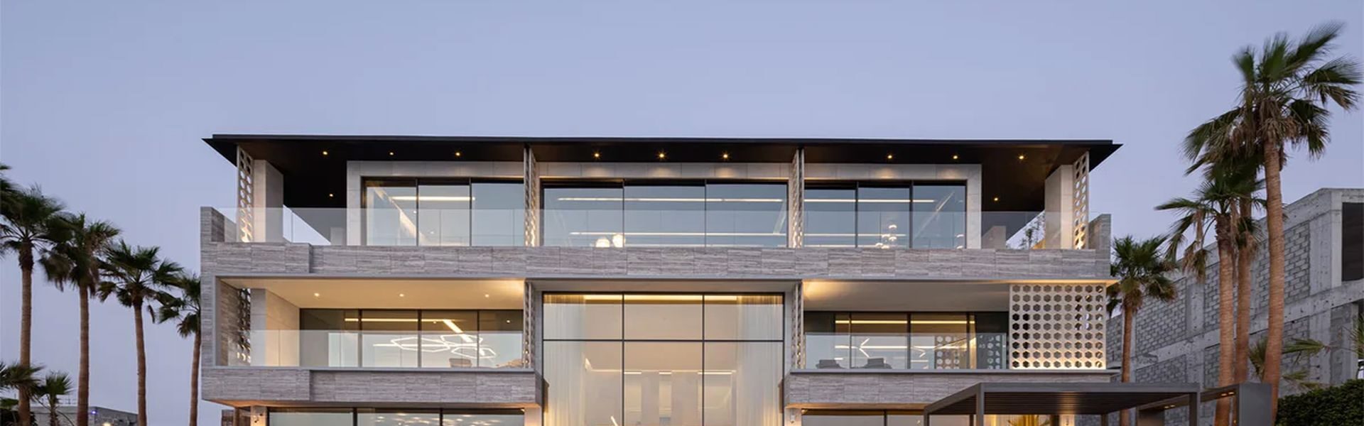 · Architectural brilliance featuring a grand double-height entrance, travertine facade with decorative concrete panels, expansive glazing, moveable screens, EuroSystems slim doors, onyx slabs with warm backlighting, and bespoke wooden ceilings